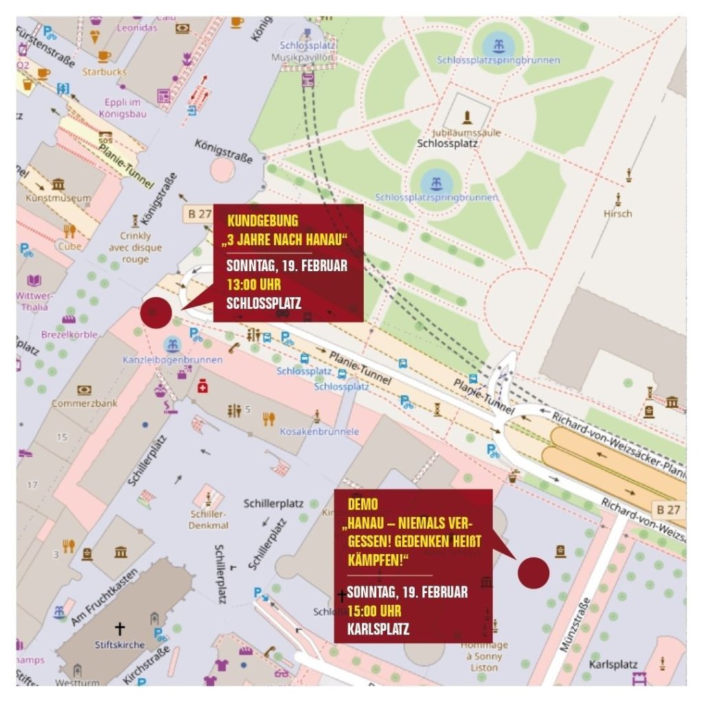 Um 13 Uhr beginnt auf dem Schlossplatz eine Kundgebung – 3 Jahre Hanau. Dazu rufen die DIDF-Jugend Stuttgart, die alevitische Jugend, Gewerkschaftsjugenden, die VVN-BdA und Parteijugendorganisationen auf.
