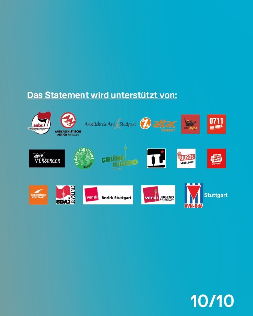 Wir als aktive Gruppen aus dem Aktionsbündnis „Stuttgart gegen Rechts“ verurteilen das Vorgehen der Polizei auf das Schärfste. Das Ausmaß an Eskalation, das die Polizei gegen die Demonstrierenden anwandte, war für den 1.Mai in Stuttgart ein Novum und stellt einen grundsätzlichen Angriff auf das Versammlungsrecht dar.