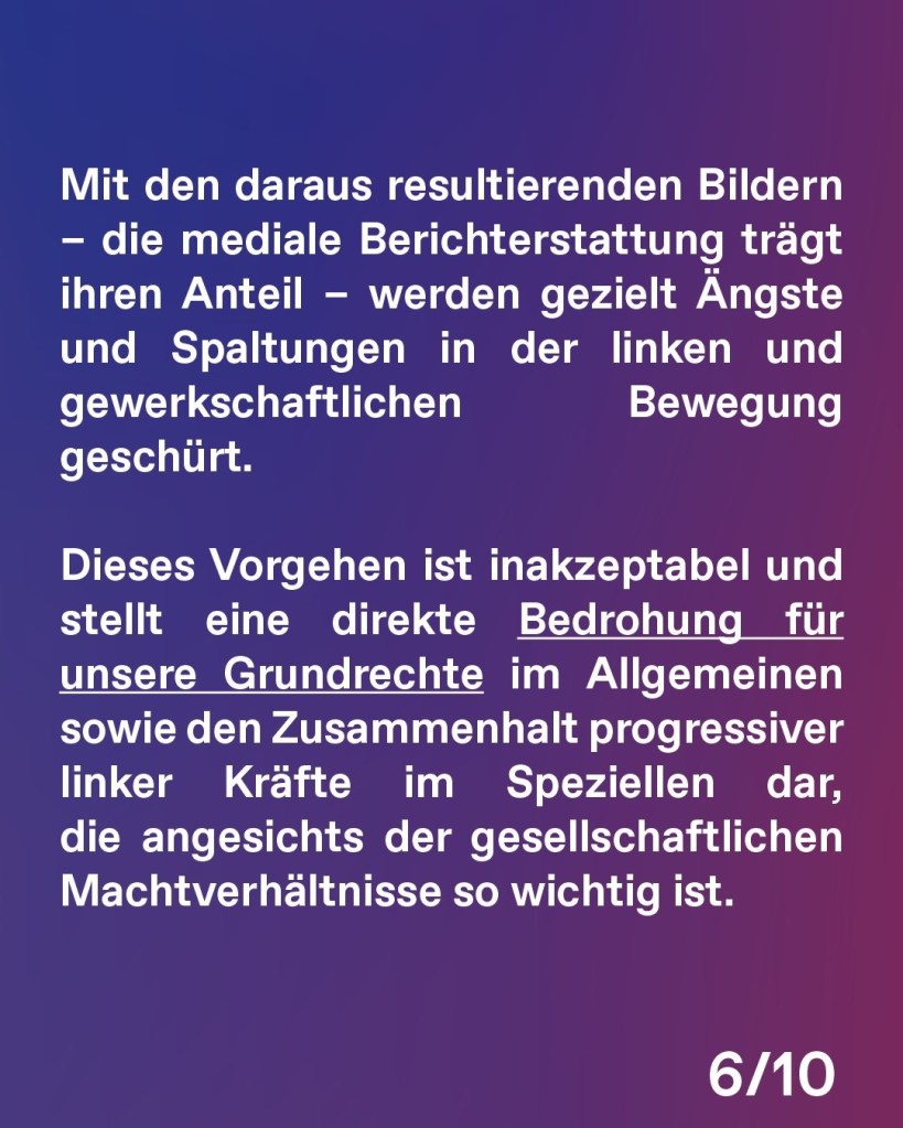 Dieses Vorgehen ist inakzeptabel und stellt eine direkte Bedrohung für unsere Grundrechte im Allgemeinen sowie den Zusammenhalt progressiver linker Kräfte im Speziellen dar, die angesichts der gesellschaftlichen Machtverhältnisse so wichtig ist.