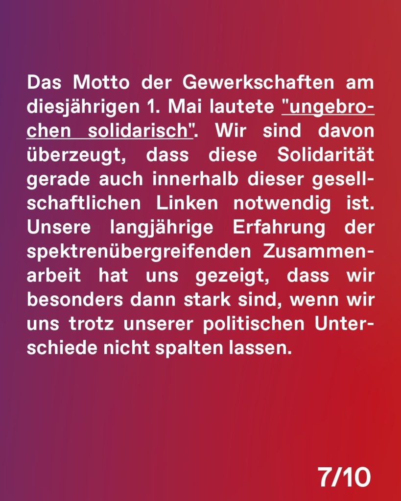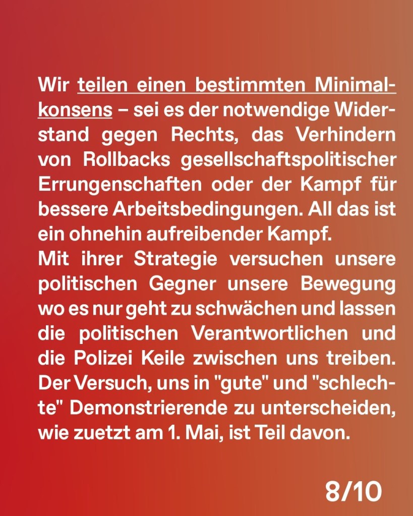 Das Motto des Gewerkschaften am diesjährigen 1. Mai lautete „ungebrochen solidarisch“. Wir sind davon überzeugt, dass diese Solidarität gerade auch innerhalb dieser gesellschaftlichen Linken notwendig ist. Unsere langjährige Erfahrung der spektrenübergreifenden Zusammenarbeit hat uns gezeigt, dass wir besonders dann stark sind, wenn wir uns trotz unserer politischen Unterschiede nicht spalten lassen. Wir teilen einen bestimmten Minimalkonsens – sei es der notwendige Widerstand gegen Rechts, das Verhindern von Rollbacks gesellschaftspolitischer Errungenschaften oder der Kampf für bessere Arbeitsbedingungen. All das ist ein ohnehin aufreibender Kampf. Mit ihrer Strategie versuchen unsere politischen Gegner unsere Bewegung wo es nur geht zu schwächen und lassen die politischen Verantwortlichen und die Polizei Keile zwischen uns treiben. Der Versuch, uns in „gute“ und „schlechte“ Demonstrierende zu unterscheiden, wie zuetzt am 1. Mai, ist Teil davon.