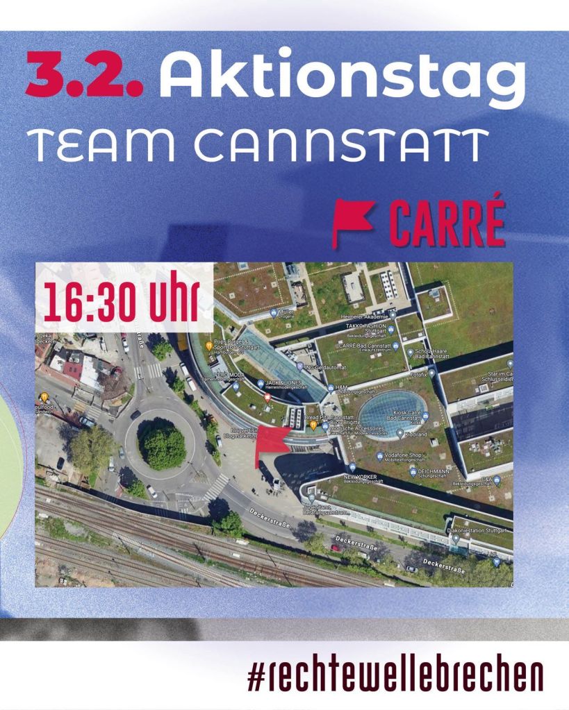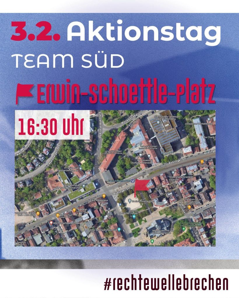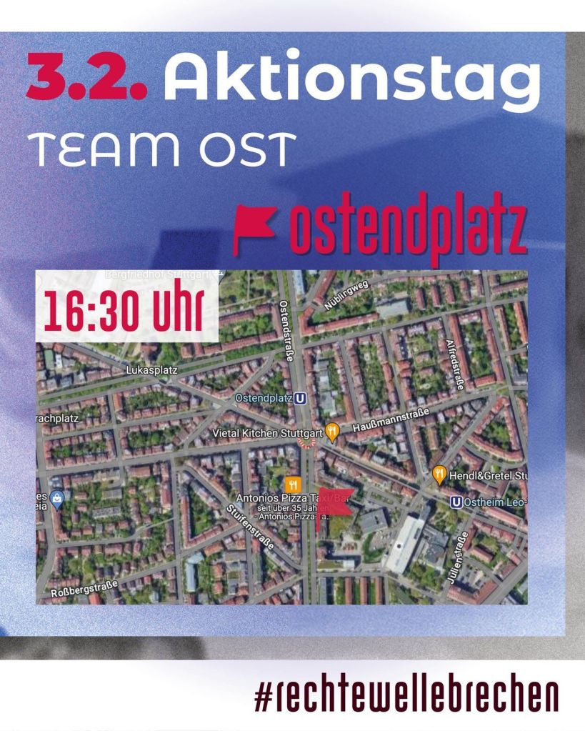 Komm vorbei in Süd (Erwin-Schoettle-Platz), Ost (Ostendstr./Jakob-Holzinger-Gasse, vor dem Rewe) oder Cannstatt (vor dem Carré) – bring Schilder, Motivation und Freund:innen mit!